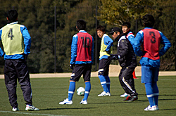 小林監督が多用したのは「ゴーバック!」というキーワード。アプローチに出て役目が終わったら素早くポジションに戻るように指示する。6対6で、ボランチ2人が相手に付いていきバイタルが空いたときに、センターバックの石井秀典がスルスルと前に出てそのスペースを埋め、ボランチが戻って来るのを確認して自分も持ち場に戻ったのは、危機察知に長けた石井らしい気が利くプレーだった。