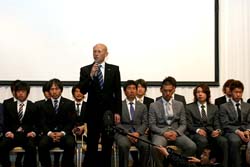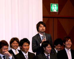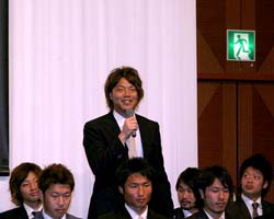 この日は、不在だったキャプテンの発表もあり、4月で33歳になる宮沢正史が新キャプテンになることが決まった。激励会前の練習後に監督に呼ばれ、「スタッフミーティングで決めたから」と言われ、二つ返事で引き受けたという宮沢選手。これまで小・中・高校ではキャプテン、大学では副キャプテンを務めてきたが、プロ11年目で初のキャプテンである。「目標はJ1昇格。そのためにはチームがひとつにならないといけない。誰一人外を向くことなく、同じ方向に向かっていけるチームにしたい」と決意表明。「今季のチームは前線に個性豊かな選手が揃い、バリエーションも多い。パサーとして彼らの能力を引き出したい」とプレーヤーとしてもチームを引っ張る。激励会終了後には、選手だけの決起集会を開き、開幕を前に選手は一つにまとまったようだ。