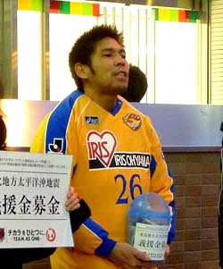 出発前、彼らボランティアスタッフが訴えた支援物資募集の声に対し、積極的に一役買って出たのが村上和弘選手だった。仙台に6年間在籍し、決して他人事ではないと感じた彼は、物資提供をチームメイトたちに呼びかけた。
