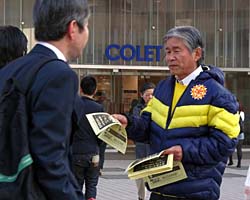 北九州の横手敏夫社長自らビラ配り。横手社長をはじめスタッフら15人が20日、北九州市小倉北区の百貨店前で4月24日の鳥取戦と5月8日の水戸戦を告知するビラ配りを行った