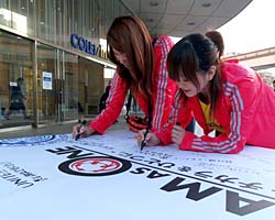 ボランティアとしてビラ配りにも参加したダンスパフォーマンスグループ「Splash」の竹中梓さんは『日本はひとつ。ともに頑張りましょう』とフラッグに記入。「同じサッカーを愛するサポーターとして一緒になって支えていきたい」と話していた。