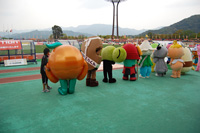 ピッチ内練習を見つめる、ゆるキャラたち。このあと恒例の100m走が行われました。