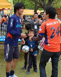 さらに別の企画として、グルメブースの中には福島第一原発による風評被害で苦しむ被災地農家の野菜を販売するコーナーも。福島県産のトマトや茨城県産のチンゲン菜など、関東の野菜がニンスタに並んでいました。ちなみにこれは、第8節の東京V戦後に東京からニンスタに帰ってくるサポーターが急遽、レンタカーを乗用車からワンボックスカーに変更し、その車に載せて運び込まれたものでした。その甲斐もあって1時間ほどで野菜は完売、愛媛でも復興に対する支援活動に対しては、まだまだ高い関心が寄せられていました。