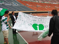 第12節・北九州戦で、長期離脱中のGK土肥洋一選手に贈る千羽鶴のための折り鶴を募集したことは、以前のJ2日記でもお伝えしました。そこで集まった鶴で完成した千羽鶴は、なんと9個! その中の1つと、同時に募ったメッセージ入りの巨大幕が、第14節・鳥取戦の前にサポーターから土肥選手に直接手渡されました。