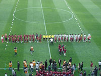選手入場時。地元の子供たちと一緒に入場し、整列。報道陣もたくさん詰めかけており、多くのフラッシュがたかれていた。