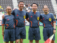 千葉vs岐阜の試合前に行なわれたエキシビションマッチのレフェリー。左から、第4の審判員を務めたゲスト審判員の廣嶋禎数氏、Jリーグオープニングと同じ主審の小幡真一郎氏、副審の菊地秀夫氏、塩屋園文一氏