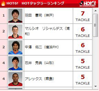 (2)HOTタックラーランキング:HOT6期間中のタックル成功数の多かった選手(HOTタックラー)のランキングです。