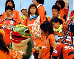 それにしても、その優勝を予言していたかのように開催された京都戦の「レディースDAY」。ニンジニアスタジアムでは女性限定のじゃんけん大会やレディースDAY限定のスイーツ出店など、様々な企画が行われていました。さらにゴール裏には「女性のための応援ゾーン」も設定。たま媛ちゃんと一緒に、女装した“一平ちゃん”も混じってゴール裏はいつもより華やかに?なったようでした。