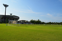 8月28日、そんな米子市で今季初めて、トップチームの活動があった。福山大学(広島)との練習試合が、同陸上競技場と同じ敷地内にある球技場で行われたのだ。さわやかな青空が広がる16時キックオフ。近隣の市町村も含め、長年にわたってガイナーレを応援している人が多い土地柄、さらに日曜日ということもあり、老若男女、約300人のファン・サポーターが詰めかけた。