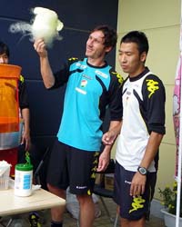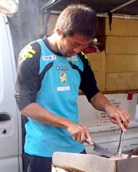 喜作の売店で、一生懸命ベーコンを焼きながらカットしようとする茶野隆行選手。鉄板から立ちのぼってくる煙にちょっと苦戦していた