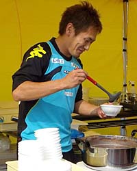 ジェフィ焼きの売店で、ジェフィ焼きとセット販売のおしるこを注文を受けて器に入れる深井正樹選手。こぼさないようにしようと、笑顔から思わず真剣な表情に変わる