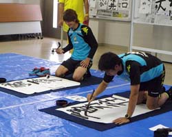 選手&社長の書道体験では、今季の残りの試合に向けての意気込みを表わした四文字熟語を書道で披露。竹内選手は『勇往邁進』、米倉選手は『猪突猛進』、三木社長は『意気軒昂』を選択し、母親が書道の師範の資格を持っている米倉選手は当初「変な字を書くと怒られるから、やりたくない」と言っていたが、堂々とした筆使いを見せていた。