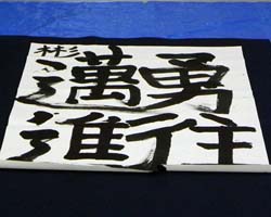 書道体験で竹内彬選手が書いた『勇往邁進』。自分の名前を書くスペースがほかになかったため、大胆にも左上に書き入れていた