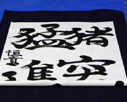 書道体験で米倉恒貴選手が書いた『猪突猛進』。この出来ばえなら、書道の師範の資格を持つお母さんにも褒めてもらえそう