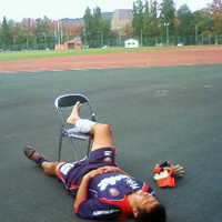 それは、23日(日)愛媛戦の翌日、控え組のボールを使ったトレーニングに入ったアシスタントコーチ兼マネージャーの信藤健太さん。どうやら、右足ふくらはぎを傷めた様子。しかし離脱することなく、練習の後片付けも終えた後、機械仕掛けの人形のようなぎこちない動きで戻ってきた。「肉離れです…。ファーストタッチでやってしまいました…」と信藤さん。選手たちは心配そうに、でもニヤニヤしながら「大丈夫ッスか?」と声を掛けていく。