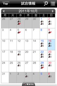 ・カレンダー上に公式戦の開催日がアイコンで表示されます。大会、チームごとの検索も可能です