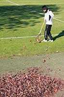 熊手で落ち葉を集める碩上さん。せっせと集めても風が吹けばまたひらひらと…
