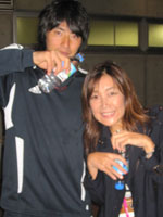 ミックスゾーン(試合後の取材エリア)では、大勢の記者さんたちが集まり、それぞれの選手に、普通に、まじめな顔をして取材をしていました。私もそこで、選手の話を聞いて歩いていたのですが、そこに、高橋秀人選手が登場。「あっ!おめでとう〜」と言おうと思った矢先、頭の上から、ざぶーーーーーーーーっ。