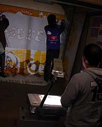 (写真3)デザイン画をプロジェクターで壁に映し出し、壁に貼り付けた模造紙に描きとる