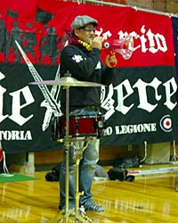 「CURVA ROSA」のリーダーは、Gate10コールリーダーの岡本透氏(写真4)。彼らのブログhttp://gate10.org/ には、ファジアーノ岡山のサポーター活動を始める前から、「岡山の街のサポーターに!」という思いが、彼らの原動力になっていた、とある。クラブの歴史を知らず、J加入と同時にひょこっと担当記者になってしまった私にとって、彼らはいろいろなことを優しく教えてくれる先輩だ。その印象は義理人情に厚く、戦国時代の武士のように自分たちの国(地域とチーム)を守り、そのためには何も厭わず、持てる力と才能を出し尽くす人たち。ひと言でいえば、かっこいい。