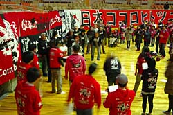 1月のある日、私は岡山市内某所の秘密基地に赴いた。岡山のサポーターたちのカンスタGate10の中心をなすグループ「CURVA ROSA」の基地として、JFL時代から使われているという場所。ここで始まっていたのは、2012シーズンの横断幕制作だ。横10m×縦2.1mのものと、横3.5m×縦2.1mのもの。今回作られる新しい横断幕は、スタジアムのサイズ等に合わせて、組み合わせを変えて掲げることも可能だ。「ココロヒトツニ」、「トモニタタカウ」という既存の横断幕も含めて、前後逆になっても意味をなすよう、言葉が徹底的に吟味されている。また、才能あるグラフィックデザイナーを抱えているらしく、エッジの効いたデザインである。デザイン自体は12月中に決定したという。