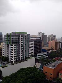 こちらはカンタス航空でシドニー経由。フライトは日本から太平洋上をひたすら南に飛ぶ。グアム、サイパンをかすめ、赤道を超えるとパプアニューギニア。そして飛行機はようやくオーストラリア大陸に入る。シドニーで乗り換え、ブリスベン。東京から直線距離で7000km、そして、サポーターのコール通り、「東京から大体10時間」。亜熱帯に属するブリスベンは蒸し暑さと雨で歓迎してくれた。天気予報によると最高気温は26度。チェックインしたホテルは冷房を入れないと汗が出てくるほどだった。