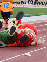 さて、この日の(ロアッソくん的)メインイベントである「ゆるキャラ100m走」に向け、彼が待ち合わせ場所に少し遅れてきた理由について「盛り上げるための準備に時間がかかった」と前編で書いた。