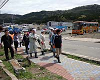 今回の東日本応援ツアーは、多くの方々とのご縁によって開催できたもの。5月4、5日とバスに同乗してガイドをしてくださったのは「みやぎ愛媛県人会」の高橋副会長。2006年のJリーグ参入時に仙台でお会いしてからのご縁です。また、バスツアーは愛媛県社会福祉協議会の助成事業として開催することができました。愛媛県が女川町の担当だったこともあり、昨年4月のチャリティーマッチで作成したメッセージ付き横断幕も同地に届けられました。1年経ってその地に行けたことも何かのご縁です。