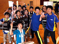 廣瀬選手の「嘘」を見破った朝日町立大谷小のみんな。手にしている楽器で、選手入場時に「オーバー・ザ・レインボー」の演奏をした