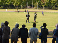 普段から鳥取のホームゲームをスタジアムで観戦している人もいるそうだが、実際にサッカーを見るのは初めてという人も多かったようで、間近で繰り広げられる練習に興味津々。DFがロングボールをヘディングでクリアする練習が始まると…