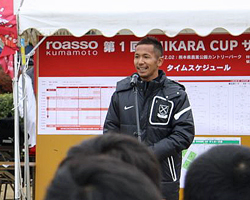 この大会が行われるきっかけとなったのが、クラブが公益財団法人熊本県農業公社と連携協定を結んだこと。熊本市から車で30分ほどに位置する合志市の「熊本県農業公園」を活用して、子どもの健全育成と地域社会活性化のために双方が手を取り合うこと、具体的には同公園内の広大な芝生広場を利用してのサッカー教室やイベントを実施し、クラブの情報を発信していくのが狙いで、連携協定を締結して1ヶ月後に早速、今大会が企画されたというわけ。大会名に名前と同じことばが入った通り、チームからは藤本主税選手が立案に参加。当日も開会宣言を行うなど、朝から終了まで会場に滞在し、子どもたちと交流を深めた。