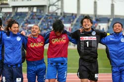 それははじめて見る光景でした。3月10日第2節・富山戦で初勝利を挙げ、選手たちは笑顔を浮かべながらバックスタンドのサポーターの元へと挨拶に行きました。サポーターは勝利のチャントを歌いながら選手を出迎えます。サポーターに向けてガッツポーズをする選手たち。そこまではいつも通りの勝利の光景でした。