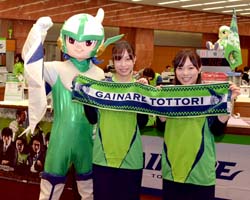 行員の方々が軒並み、ガイナーレカラーを身につけているのだ。そして傍らには、クラブマスコットの「強小戦士 ガイナマン」も!
