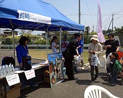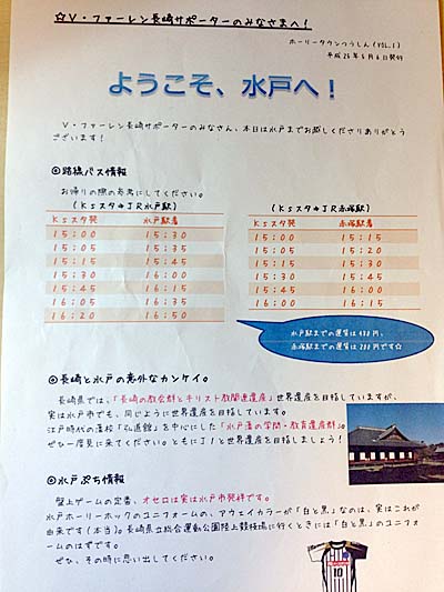 「おもてなしブース」ができたのです。アウェイのサポーターに無料で麦茶や飲料水を提供し、水戸市の観光マップや帰りのバスの時刻表が掲載された「ホーリータウンつうしん」(画像をクリックすると拡大されます)を配布するなど、まさに至れり尽くせりの“おもてなし”で長崎サポーターを迎えました。