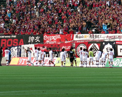 尾原千明さんのマッチレポート冒頭にある通り、2点を返してなお勢いづく岡山の猛攻にさらされた熊本は、GK南雄太選手が危険な状態で落下し、アディショナルタイムに数分間試合は中断します。試合後、サポーターと恒例の「カモン!ロッソ」のダンスを終えた熊本の選手たちが岡山サポーターのもとへ挨拶に行った経緯についても尾原さんが触れておられますが、先日の大宮対広島戦でのアクシデントもあったとは言え、こうした突発的な事態に(しかもまだリードされている状態で)フレキシブルな対応ができる、岡山サポーターの度量の大きさを感じました。