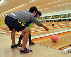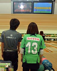 スペアを狙う女性に投げるコースをアドバイスする永里。本気なのである