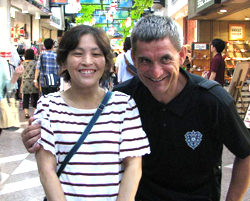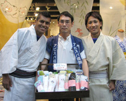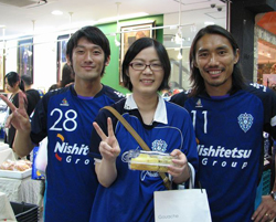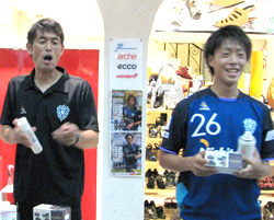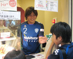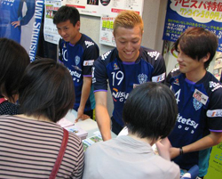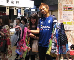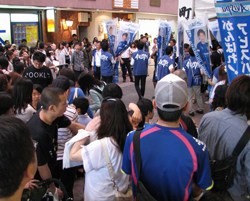 選手たちが店頭に立ったのは、新天町商店街のうち19のイベント協賛店舗。全スタッフ、全コーチが2〜3人ずつのグループに分かれ、それぞれ40分間ずつ接客を行った。両手いっぱいに新商品を抱えていたのは山口和樹。いつものように大きな声で商店街を歩く人たちに声をかける。浴衣姿で接客したのはオズマールと金森健志のコンビ。粋な姿での接客に、手拭タオルが次から次へと売れていく。木原正和、堤俊輔、中原秀人は、特設コーナーに立ってのワンコインCD発売。3人が特設コーナーの前に立つと、あっという間に人だかりが出来た。