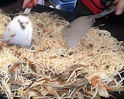 スタジアム周りにはズラリと屋台が並ぶ。カレー、焼き鳥、から揚げ、たこ焼きなどの定番メニューから、長崎らしさを感じさせるものまで、実に様々。どれもこれもおいしそうで、ついつい財布の紐が緩む。必ず味わいたいのは噂の「ハトシ」。食パンの間にエビなどのすり身を挟んで揚げたもので、揚げたパンの香ばしさと、その中から現れるエビの身が絶妙にマッチしている。そして「浦上そぼろ焼きうどん」。浦上そぼろとは、ひき肉のそぼろではなく、豚肉とゴボウ・モヤシ等の野菜を炒めたもののこと。きんぴらごぼうのような甘辛い味付けの浦上そぼろと、パスタのような食感の五島うどんが織りなす味は、我々が知っている焼きうどんとは違った味わいが楽しめる。ホルモン好きには、「諫早ホルモン」がお勧めだ。煮込みは濃厚な味わい。串焼きは塩味のあっさりした風味。パリパリ麺の上にホルモンの煮込みをかけた諫早ホル麺も捨てがたい。