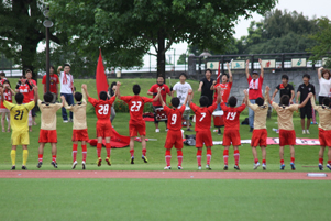 九州地区の代表決定戦となったのは、6月22日に行われたFC KAGOSHIMAとのゲーム。トップチームのJ2リーグの20節・ザスパクサツ群馬戦と同じ日で、会場もうまかな・よかなスタジアムに隣接する補助競技場だったため、熊本サポーターも多数応援に駆けつけた。試合は先制される厳しい展開となったが、終了間際に得たPKをキャプテンの池谷友喜選手(監督代行の息子さんです)が決めて追いつき、延長に入って勝ち越し、全国大会への切符を手にした。