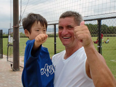 夏真っ盛りの雁の巣球技場。夏休みを利用して多くのファン、サポーターが練習見学に訪れる。8月1日、福岡サポーターなら知る人ぞ知るサポーターが東京からやってきた。よかちょ君、3歳。レベルファイブスタジアム・デビューは生まれて1カ月の時。今では、サポーターのチャントに合わせて両手を突き上げ、「こんいろ〜の、まりあんあびすぱ〜」と口ずさむ立派なサポーターだ。3人兄妹の末っ子で、夏休みを利用しておじいちゃん、おばあちゃんのところに里帰りしている、同じくバリバリの福岡サポーターのお姉ちゃん2人に連れられて、雁の巣球技場にやってきた。