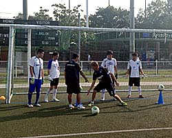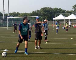その声にピッチにも緊張感が走り、コーチからの1つ1つの声に参加者の誰もが真剣に耳を傾け実践する。ボールを使ったトレーニングで小井戸正亮コーチからG大阪のパスサッカーについての秘密(?!)が明かされると、参加者からは思わず拍手がわき起こるシーンも。実際にコーチ陣も混じってそれを実践するにあたっては、頭と身体がなかなかイコールにならず苦笑いを浮かべる参加者も多かったが、そんな時は長谷川健太監督がゲキを飛ばす!