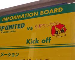 9月15日のJ2リーグ第33節・千葉−京都戦でのフクアリのインフォメーションボードには京都のマスコットの『パーサくん』がカラーで描かれ、『京都サンガFC』の文字は京都のチームカラーのパープルのような色だった。
