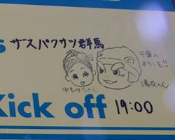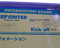 J2リーグ第33節・千葉−京都戦で、試合前写真の撮影を終えて記者控室に戻る時にフクアリのコンコースのインフォメーションボードの前を通ると、ボードには京都のマスコットの『パーサくん』の絵が描いてありました。8月21日のJ2リーグ第30節・千葉−群馬戦のインフォメーションボードでは群馬のマスコットの『湯友』くん、そして『ゆもみちゃん』、さらに千葉のマスコットの『ジェフィ』&『ユニティ』や『みなちゃん』の絵が見られました。千葉のボランティアスタッフかサポーターの方が描いているようです。