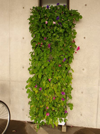 管理事務室の窓の日除けになっている朝顔は、ピンクや紫など色や模様がさまざまな綺麗な花をつけていた。