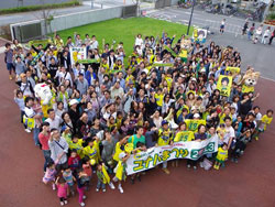 『ユナパまつり2013』の締めくくりは来場者が集合しての記念撮影、そして名作写真、選手サイン入りの公式試合球やレプリカユニフォーム、フェアプレーフラッグ、選手用のトレーニングウェアが当たる大抽選会。終始、和やかな雰囲気のお祭りだった。