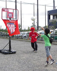 千葉ジェッツのスタッフ(変装した赤いTシャツ姿の男性)が協力して行われたジェフ☆アトラクションパークのフリースローイン。スタッフは「ジェフ(千葉)もいいけど、千葉ジェッツもよろしくね!」と参加者にアピールしていた。