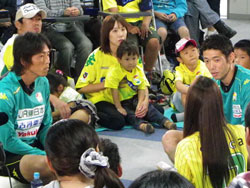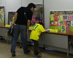 東日本大震災チャリティサイン会はオープニングセレモニー終了後からスタートし、ジェフィ&ユニティ、みなちゃんに続いてトレーニング終了後の選手が次々と登場。櫛野亮選手、米倉選手、田中佑昌選手、佐藤健太郎選手、キム・ヒョヌン選手、兵働昭弘選手、岡本昌弘選手がサイン会のブースに現われると多くの人が行列を作り、当日の募金総額は11,972円となったそうだ。