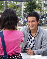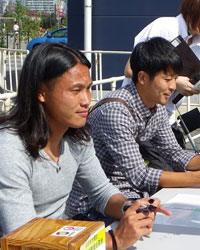 東日本大震災チャリティサイン会に登場した米倉恒貴選手は、爽やかな笑顔を見せながらサインを書いていた。
