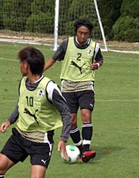昨日クラブから引退が発表された北嶋秀朗。会見を行う前の午前練習でも、いつも通りにプレー。紅白戦では、すばらしいポストプレーで堀米の得点をアシストした
