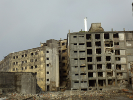 遠目から見る高層アパートはもはや骨と皮だけといった状態。その周辺に生物の気配は全くない。倒壊も間もないであろうアパート群を見つめていると、まるで吸い込まれていくかのような錯覚に陥り、もちろん周りには同じツアー客が声を上げているのにも関わらず、何故か一人ぼっちになってしまったかのような、言いようのない寂寥感を覚えてしまった。櫛の歯が抜けるようにこの島を1人去り2人去り…。最後の最後まで残った人も同じような感情に囚われていたのかもしれない。ましてや、この島の海底奥深くには数度の炭鉱事故で眠り続ける炭鉱夫たちがいる。大袈裟でも何でもなく、死と隣り合わせの世界。若く独り身の炭鉱夫はその厳しさにすぐに逃げるように島から離れ、残ったのは家族のいる者ばかりだったとツアーガイドは説明する。まさに美輪明宏の「ヨイトマケの歌」の世界である。ふと見渡せば、島から見えるのは水平線のみ。5,000人分もの肉や米、野菜を陸地から運んでくるだけでもいい加減くたびれる話であるし、採掘当初などは飲み水すら事欠く、住居環境や労働環境も劣悪そのものだったことは容易に想像できる。